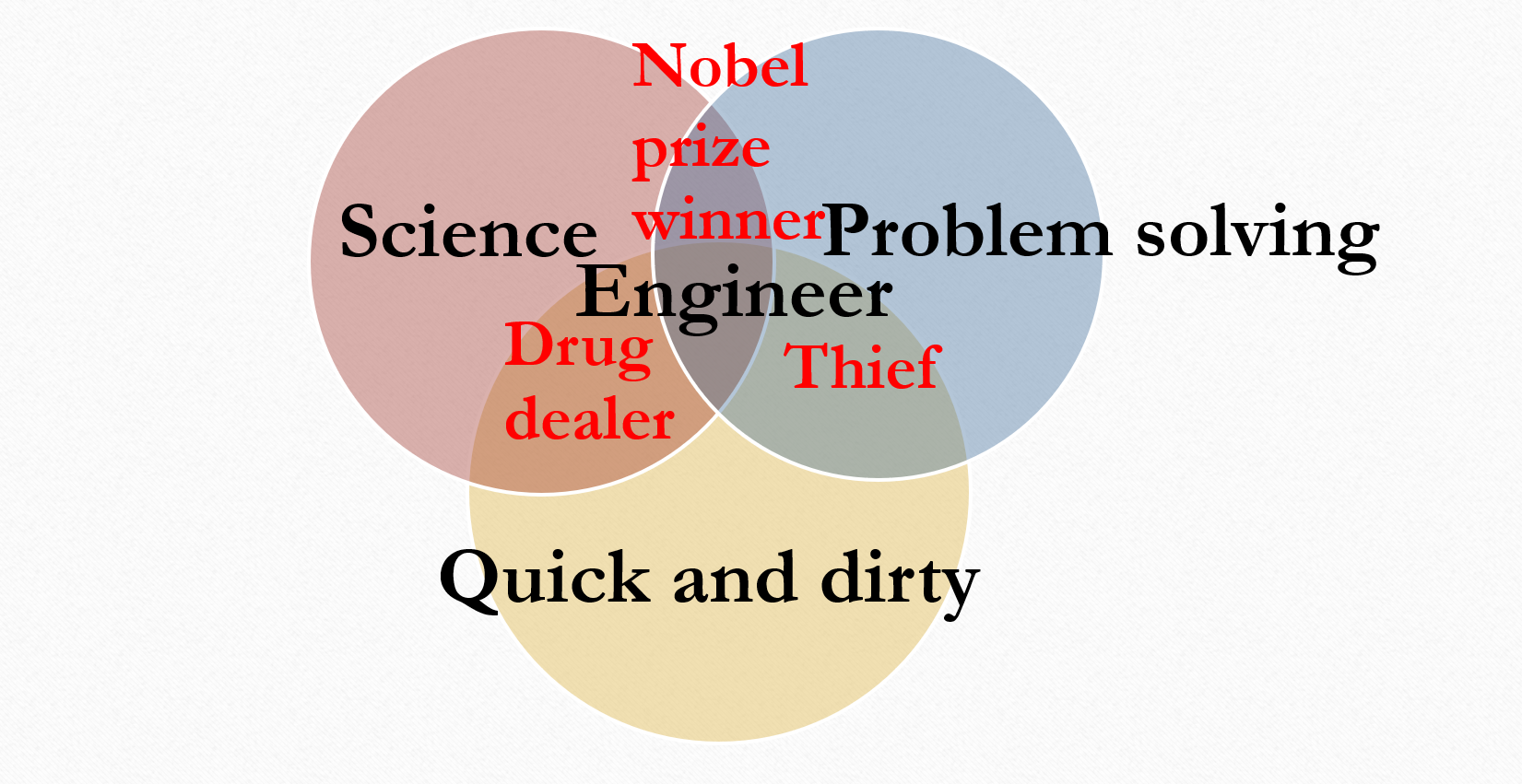 The image above is a Venn diagram to describe an engineer, any engineer. According to this diagram, engineers should do their work quickly and dirty. But this will cost a lot in the long run or even in the short run, so you should try to proceed with principles from the very beginning.
